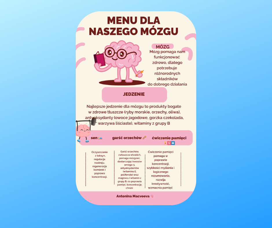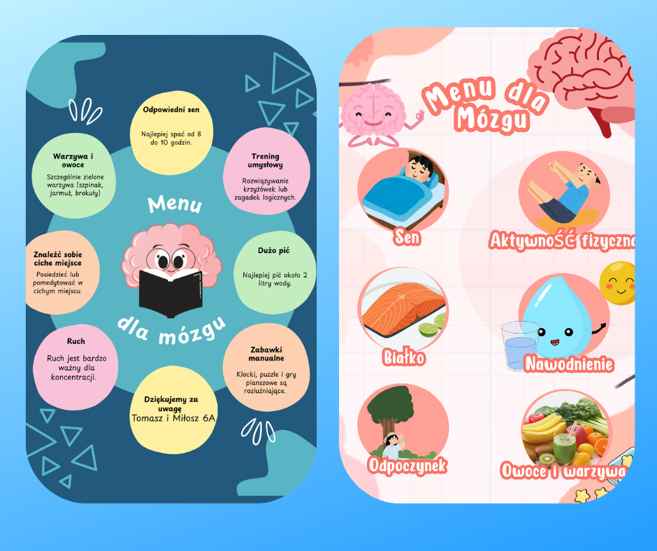 - Uczniowie klasy VIA, na podsumowanie zajęć o zdrowiu fizycznym na zajęciach edukacji zdrowotnej, przygotowali infografiki pt. Menu dla mózgu w programach Canva lub Freefom.